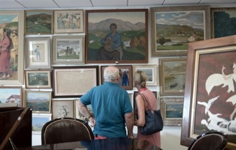 | Un couple regarde le tableau "La Mère" de l'artiste basque Ramiro Arrue à Saint-Jean-de-Luz (Pyrénées-Atlantiques), le 3 août 2017. |