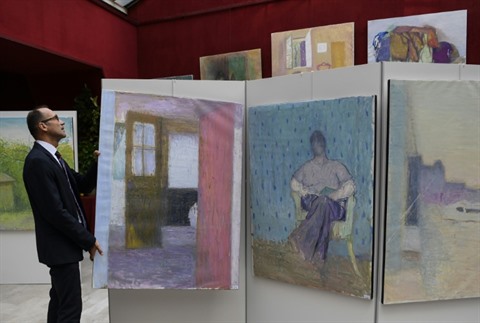 | Le commissaire-priseur Antoine Bérard devant des tableaux du peintre Jacques Truphémus exposés avant leur vente aux enchères par la maison de vente Ivoire, le 11 septembre à Lyon. |