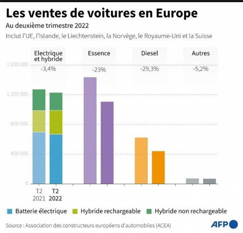 Les moteurs à explosion souffrent particulièrement sur un marché paralysé par la pénurie de composants électroniques : les ventes d'automobiles ont globalement chuté de 14% dans l'UE au premier semestre 2022 comparé à la même période de 2021. Quelque 4,6 millions de véhicules neufs ont été vendus dans l'UE, où les principaux marchés affichent tous des chutes à deux chiffres.