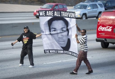 | Des personnes manifestent leur colère après l'acquittement de George Zimmerman, en bloquant la circulation sur une artère de Los Angeles, le 14 juillet. |