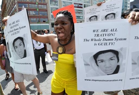 | Une femme manifeste à New York en tenant à la main des portraits de Trayvon Martin, après l’acquittement de George Zimmerman, le 14 juillet. |