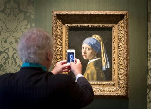 | Un visiteur du musée Mauritshuis prend en photo +La jeune fille à la perle+ de Vermeer, à La Haye, aux Pays-Bas, le 20 juin 2014. |