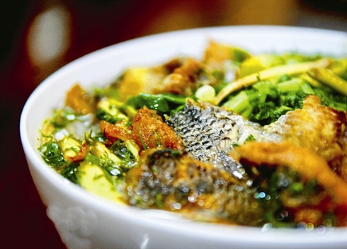 Des anabas (perches asiatiques); de l’oenanthe aquatique (fenouil aquatique), du chou vert, de l’aneth et ciboulette, ciboules séchées, gingembre, sel et poivre, sauce nuoc mam, huile de cuisson, ail, piment rouge, et vermicelles de riz.