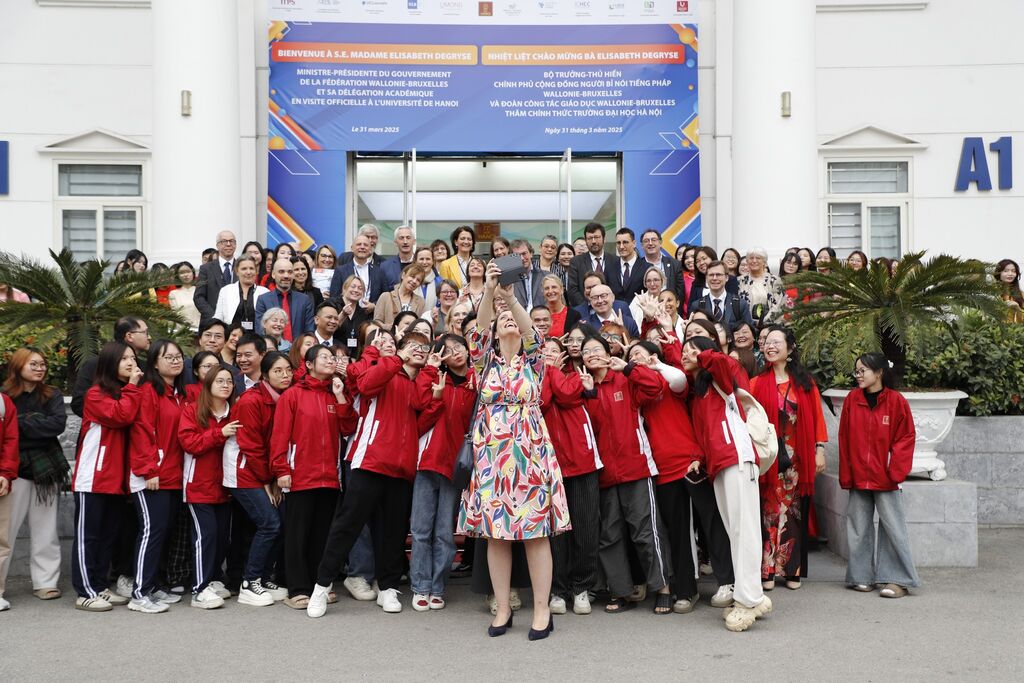| La ministre-présidente Élisabeth Degryse et des étudiants de l’Université de Hanoï. |