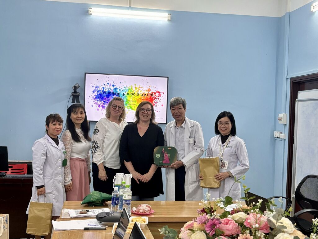 | Dans le cadre de leur mission au Vietnam du 17 au 26 février 2025, deux expertes de la Haute École Léonard de Vinci, Sophie Brassseur (3e à droite) et Déborah Vierendeels (3e à gauche), ont effectué une visite à l’Hôpital national de pédiatrie à Hanoï, partenaire de longue date dans le secteur de santé de la Délégation Wallonie-Bruxelles au Vietnam. |