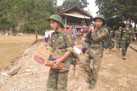 | Des soldats assistent des victimes des crues à Sa Na, province de Thanh Hoa (Centre), le 3 août 2019. |
