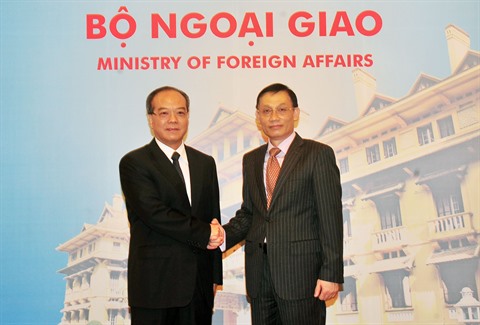 | Le vice-ministre vietnamien des Affaires étrangères Lê Hoài Trung (droite) et le vice-gouverneur permanent de la province chinoise du Guangdong, Lin Shao Chun, le 19 juillet à Hanoï. |