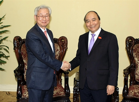 | Nguyên Xuân Phuc (droite) et Jun Dae Joo, le 4 avril, à Hanoi. |