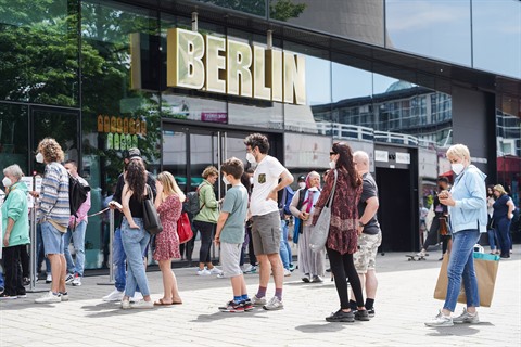 | Les gens portent des masques pour prévenir l'épidémie de COVID-19 devant un magasin à Berlin, le 4 juin. |