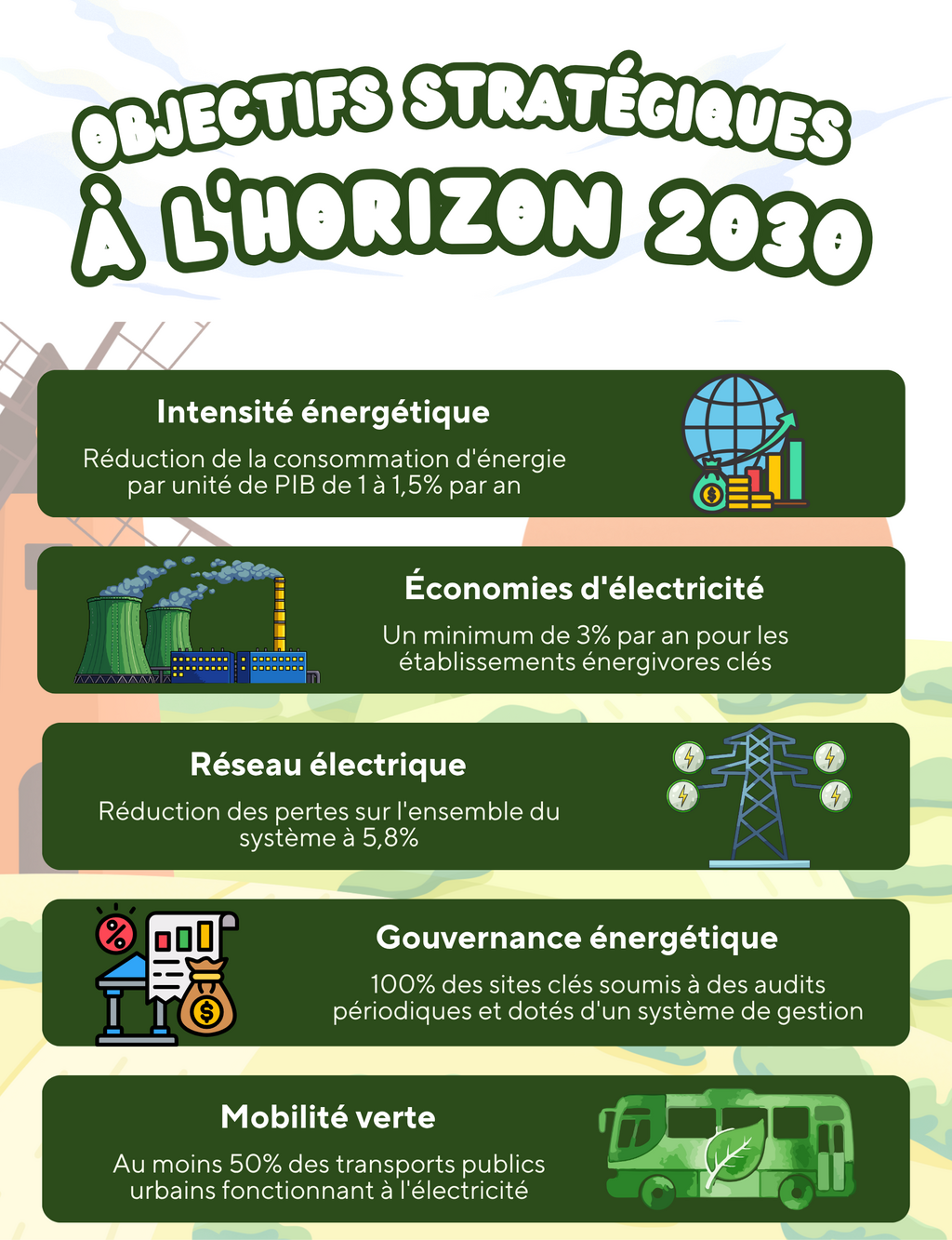 La vision portée par la Directive 09 s'appuie sur des indicateurs de performance d’une grande précision à l’horizon 2030. Le gouvernement aspire ainsi à réduire l'intensité énergétique par unité de PIB à un rythme annuel soutenu, compris entre 1% et 1,5%. Pour les industries lourdes et les établissements grands consommateurs, l'exigence est encore plus stricte avec une cible d'économie d'électricité fixée à un minimum de 3% par an.