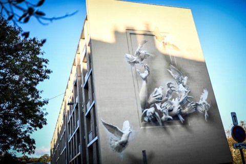 Plus loin, des illustrations des Fables de la Fontaine égayent des armoires électriques, des trompe-l'œil de magasins d'époque habillent les murs nus du centre-ville, une dizaine d'immenses fresques peintes par des artistes internationaux annoncent l'unique quartier HLM de la ville.