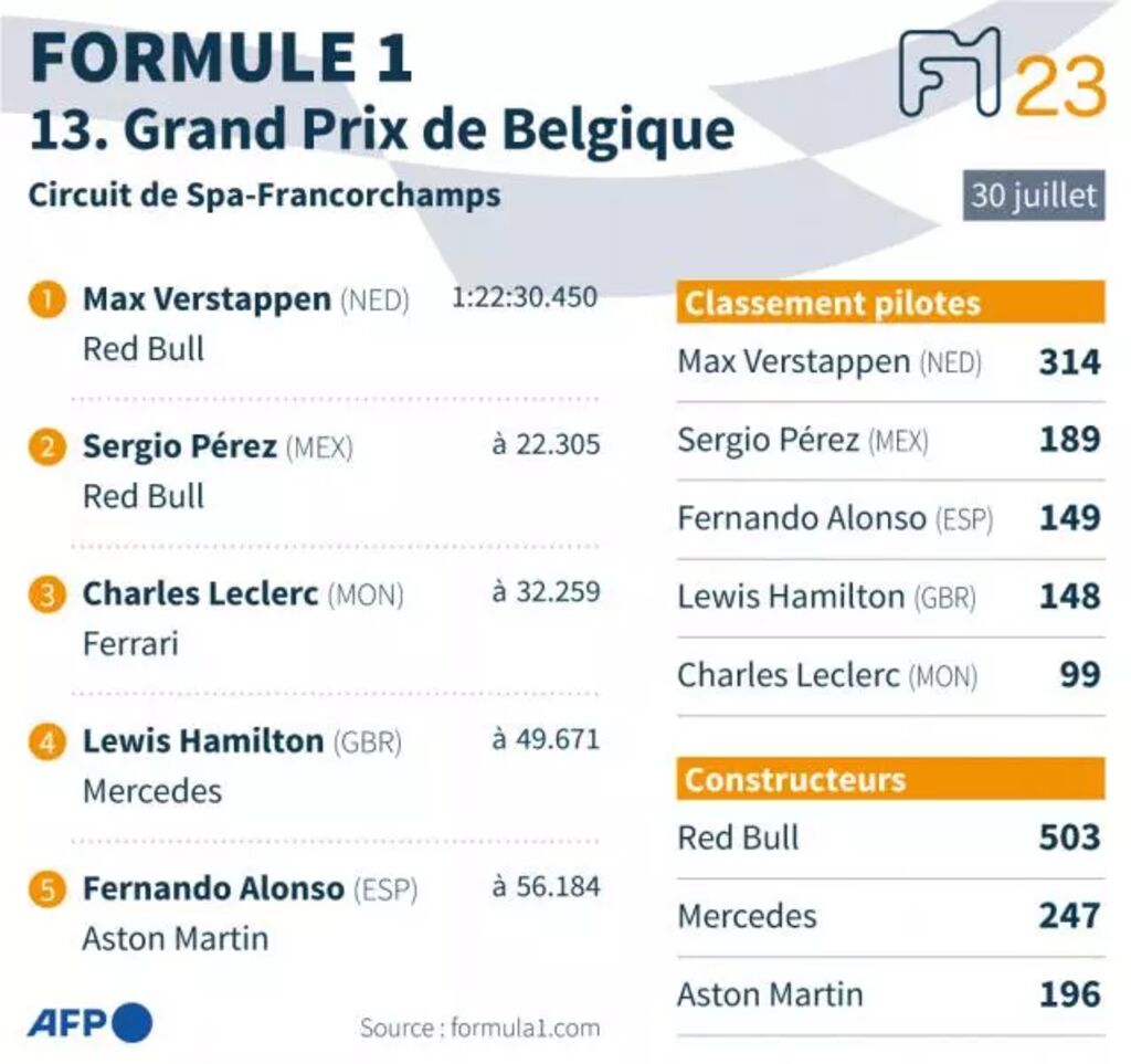 Le double champion en titre, qui signe son 3e succès consécutif à Spa en F1, possède désormais une avance stratosphérique de 125 points sur son premier poursuivant Sergio Pérez, auteur de son deuxième podium consécutif en GP.