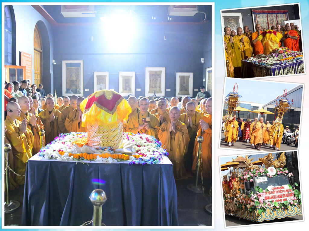 | Après la cérémonie d'accueil à l'aéroport de Tân Sơn Nhất, les reliques du Bouddha Shakyamuni ont été transportés à travers les rues de Hô Chi Minh-Ville jusqu'à l’Institut bouddhique du Vietnam. |