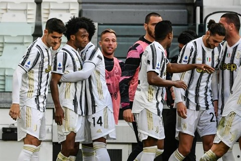 | La joie du milieu de terrain colombien de la Juventus, Juan Cuadrado, félicité par l'attaquant Federico Chiesa, après avoir marqué sur pénalty face à l'Inter Milan, lors de leur match de Série A, le 15 mai à Turin. |