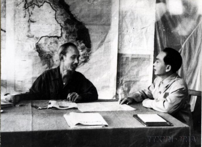 | Le 7 mai 1954 à 17h30, le drapeau "Déterminé à se battre, déterminé à gagner" de l’Armée populaire du Vietnam flotte sur le toit du QG De Castrie, marquant la victoire complète de l’armée et du peuple vietnamiens contre les colonialistes français après 56 jours et nuits de combats courageux avec une volonté de fer. La victoire de Diên Biên Phu "a résonné à travers les cinq continents et a ébranlé le monde". |