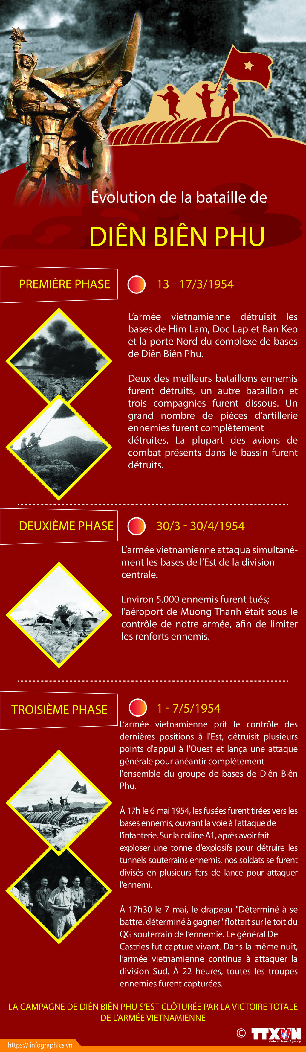 Le 7 mai à 17h30, le drapeau de l’armée vietnamienne flottait sur le toit du QG souterrain de l'ennemi. Jusqu’à la fin du même jour, toutes les troupes ennemies étaient capturées. Pour remporter la victoire finale, l'armée vietnamienne a passé 56 jours et nuits héroïques et tenaces.
