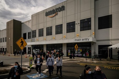 | Des salariés devant l'entrepôt d'Amazon JFK8, dans le quartier de Staten Island à New York, le premeir jour du vote, le 25 mars |