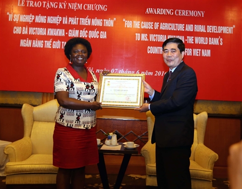 | Le ministre vietnamien de l'Agriculture et du Développement rural, Cao Duc Phat, remet l'insigne à la vice-présidente de la Banque mondiale pour l'Asie de l'Est et le Pacifique,Victoria Kwakwa, le 7 juin à Hanoi. |