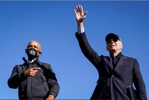 | Barack Obama et Joe Biden le 31 octobre 2020 à Flint, dans le Michigan. |