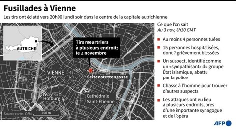 L'Autriche, sous le choc, a décrété trois jours de deuil national. À travers le pays, les drapeaux ont été mis en berne sur les bâtiments publics et une minute de silence observée à midi, tandis que les cloches des églises ont sonné. Parmi les quatre victimes, figurent un homme et une femme âgés, un jeune passant et une serveuse, a précisé le chancelier Kurz. L'une de ces victimes est allemande, a annoncé Berlin.