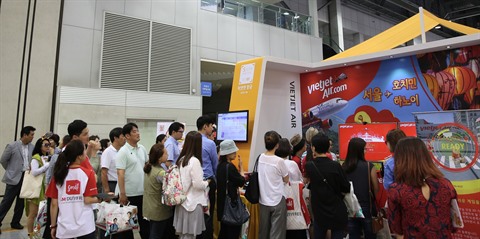 | De nombreux visiteurs se regroupent aux stands de la compagnie low-cost Vietjet lors de la foire internationale du tourisme en République de Corée. |