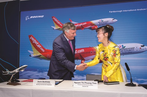 Nguyên Thi Phuong Thao, PDG de Vietjet, et Kevin McAllister, PDG de Boeing Commercial Airplanes, ont représenté chaque partie à la signature le 18 juillet du contrat colossal, lors du Salon aéronautique de Farnborough 2018 (Farnborough International Airshow) au Royaume-Uni.
