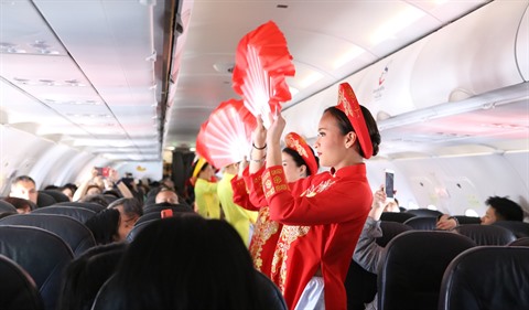 Lors du vol inaugural de Vietjet, les passagers ont pu découvrir avec plaisir la danse traditionnelle vietnamienne et recevoir des souvenirs offerts par Vietjet.