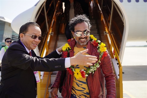 | Le directeur général adjoint de Vietjet, Dô Xuân Quang (gauche), accueille un des premiers passagers des nouveaux vols de Vietjet. |