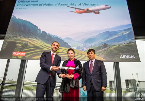 | La présidente de l’AN vietnamienne Nguyên Thi Kim Ngân à la cérémonie de livraison de l’avion A321neo portant le numéro VN-A600 de Vietjet à l’usine d’Airbus à Toulouse. |