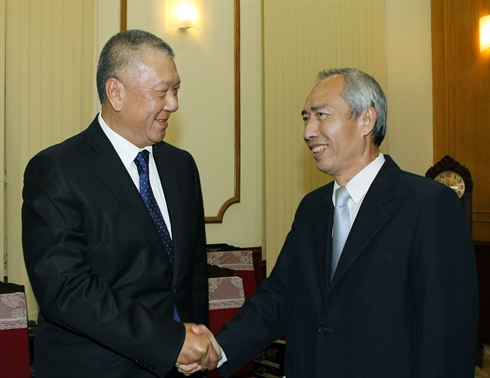 | Le président du Front de la Patrie du Vietnam, Huynh Dam (droite), et He Hou Hua, vice-président de la Conférence consultative politique du peuple chinois, le 3 mai à Hanoi. Photo: Nguyên Dân/VNA/CVN |