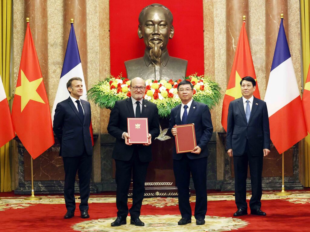 | Échange de l'accord de prêt pour le projet de renforcement du réseau de transport d'électricité du Sud entre EVN NPT et l'AFD, dans le cadre de la visite d'État du président français Emmanuel Macron au Vietnam en mai 2025. |