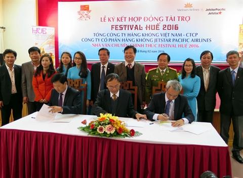 La cérémonie de signature du contrat de sponsoring a eu lieu le 24 février dans la ville de Huê, province de Thua Thiên-Huê (Centre). Ainsi, à ce jour, outre Vietnam Airlines et JPA, la Banque de l’Agriculture et du Développement rural (Agribank) et la Banque par actions du commerce extérieur du Vietnam (Vietcombank) sont deux sponsors principaux du 9e Festival de Huê, avec 3 milliards de dôngs chacun. L'opérateur mobile MobiFone, "sponsor de bronze", assure les services de télécommunication de cet événement, à hauteur d’un milliard de dôngs…