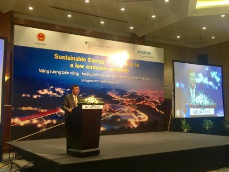 | Le vice-ministre de l’Industrie et du Commerce, Hoàng Quôc Vuong, durant son intervention au colloque "Énergies durables – vers une économie ayant une faible émission carbone", le 24 août à Hanoï. |