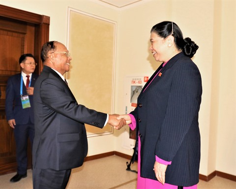 | La vice-présidente permanente de l’Assemblée nationale du Vietnam, Tong Thi Phong et le président du Parlement cambodgien, Samdech Heng Samrin, en marge de MSEAP4 |