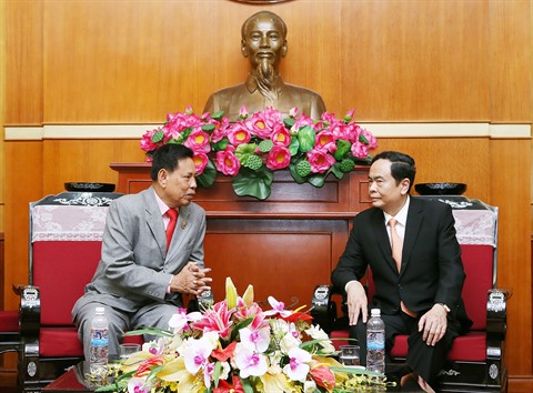 | Le nouveau président du CC du FPV, Trân Thanh Mân (droite), et le secrétaire général par intérim du Conseil national du FSDPC, Nhem Valy, le 24 juin à Hanoï. |
