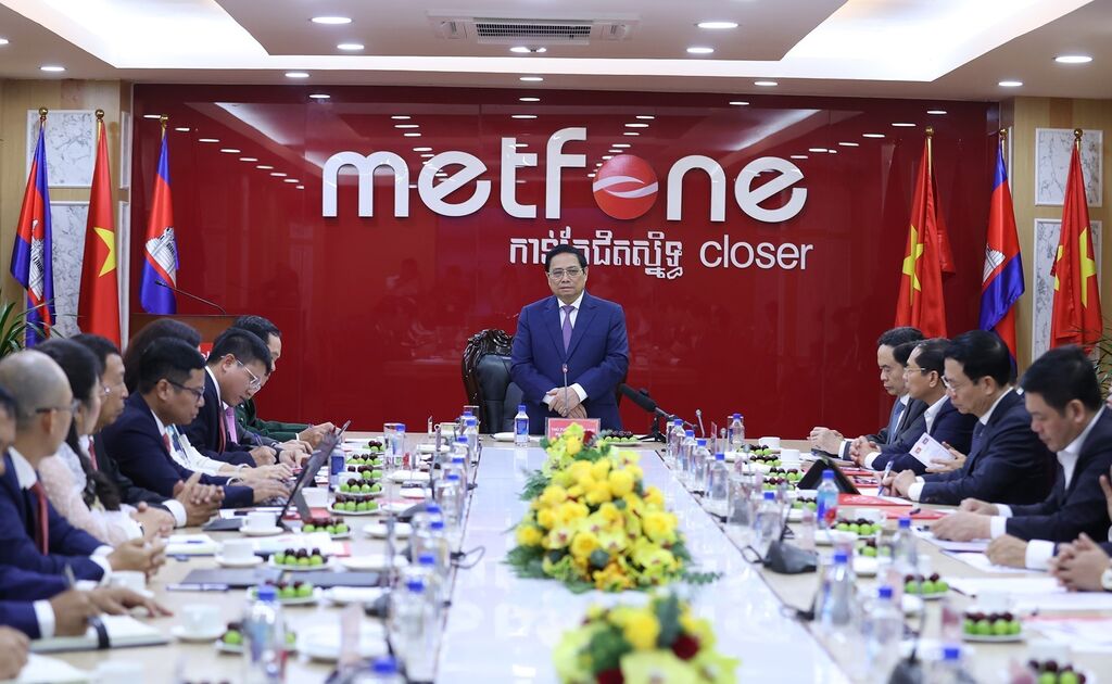 | Le Premier ministre Pham Minh Chinh travaille avec la Société de télécommunications Vietnam-Cambodge (Metfone). |