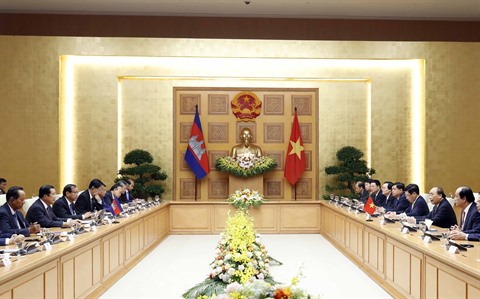 Le matin du 4 octobre, après la cérémonie d’accueil solennelle officielle au Palais présidentiel, le Premier ministre vietnamien Nguyên Xuân Phuc a eu un entretien avec son homologue cambodgien Hun Sen. Les Premiers ministres Nguyên Xuân Phuc et Hun Sen ont affirmé que les relations entre le Vietnam et le Cambodge constituaient une fraternité étroite et inséparable. Les deux pays se sont tenus côte à côte, sacrifiant le sang pour l'indépendance nationale et le bonheur de la population de chaque pays, ce qui constitue un bien précieux que les deux pays sont déterminés à préserver et à transmettre pour les générations futures.