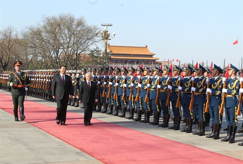 | Le secrétaire général du PCV, Nguyên Phu Trong (droite), et son homologue chinois Xi Jinping passent en revue la garde d'honneur, le 7 avril à Pékin. |