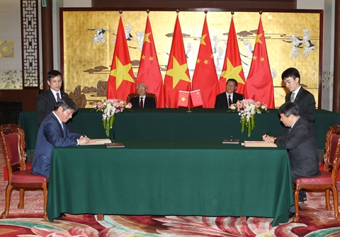 | Signature d'un mémorandum sur la création du groupe de travail sur la coopération dans les infrastructures routières entre le ministère vietnamien du Plan et de l'Investissement et le Comité de réforme et de développement national de Chine, le 7 avril à Pékin. |