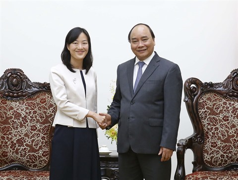 | Le Premier ministre Nguyên Xuân Phuc et la directrice générale du groupe taïwanais Pou Chen, Tsai Pei-Chun. |