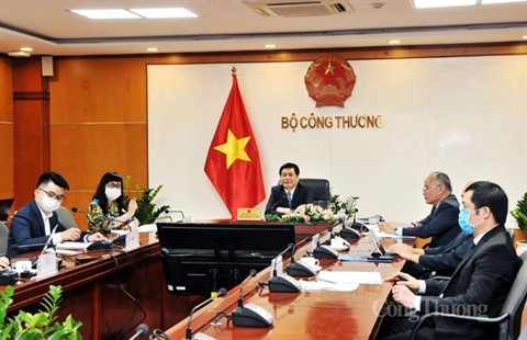 | Le ministre vietnamien de l'Industrie et du Commerce, Nguyên Hông Diên (centre), s'exprime lors de la conversation téléphonique. |
