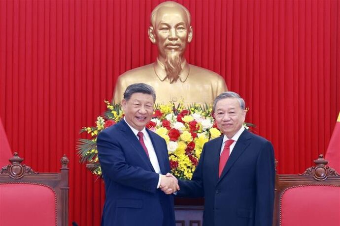 | Le secrétaire général du Parti, Tô Lâm, (droite) et le secrétaire général du Parti communiste chinois et président de la Chine, Xi Jinping, le 14 avril 2025, à Hanoï. |