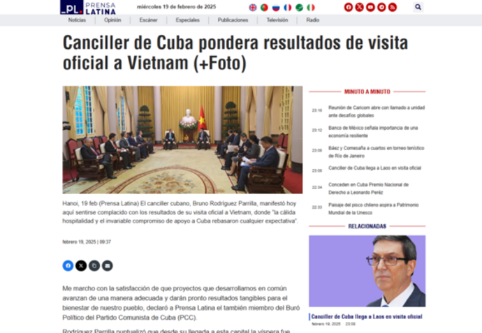 Le programme que j’ai suivi a été très intense. Ce sont des visites courtes mais très productives. J’ai eu l’honneur d’être reçu par le secrétaire général du Parti, le camarade Tô Lâm, et d’avoir une conversation très détaillée et efficace. Ce fut également le cas du président de la République, Luong Cuong, et avant lui du Premier ministre Pham Minh Chinh. Et il a eu des entretiens officiels et une excellente séance de travail avec le le vice-Premier ministre et ministre des Affaires étrangères Bùi Thanh Son. Dans tous ces événements, nous avons pu constater le niveau excellent, extraordinaire et optimal des relations et du soutien mutuel entre le Vietnam et Cuba.