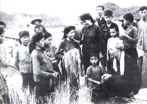 | Le Président Hô Chi Minh (premier plan à droite) avec des paysans de la province de Thai Nguyên en 1954. |