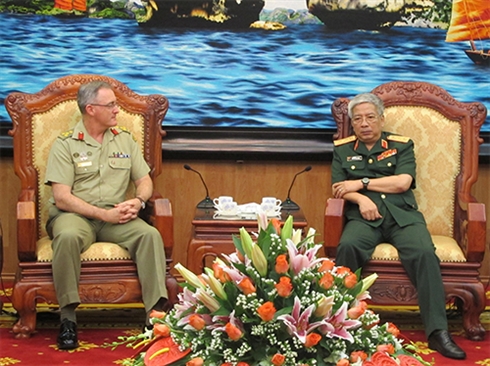 | Le général de corps d'armée Nguyên Chi Vinh (droite), vice-ministre de la Défense, et le lieutenant-général John Mackenzie, de la Division de politique internationale du Département australien de la défense, le 8 septembre à Hanoi. |