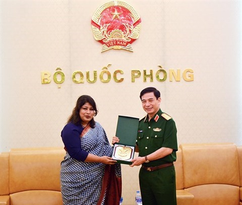 | Le général de corps d’armée Phan Van Giang, chef de l'état-major général de l'Armée populaire du Vietnam, vice-ministre de la Défense, et l’ambassadrice du Bangladesh, Samina Naz. |