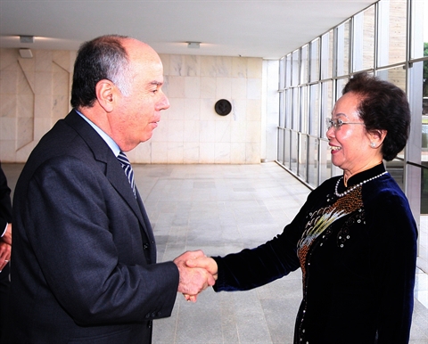 | Le ministre brésilien des Affaires étrangères Mauro Vieira et la vice-présidente Nguyên Thi Doan. |
