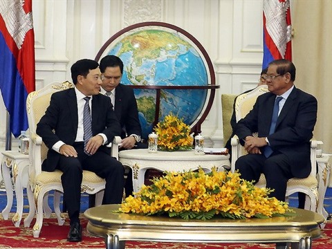 | Le vice-Premier ministre et ministre des Affaires étrangères Pham Binh Minh (gauche) et le Premier ministre p. i du Cambodge, Samdech Sar Kheng, le 14 mars à Phnom Penh. |