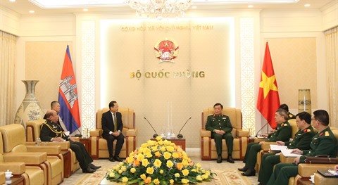 | La rencontre entre le vice-ministre de la Défense, Hoàng Xuân Chiên (droite) et le nouvel ambassadeur du Cambodge Chay Navuth et le colonel Rem Kan, nouvel attaché militaire cambodgien au Vietnam. |