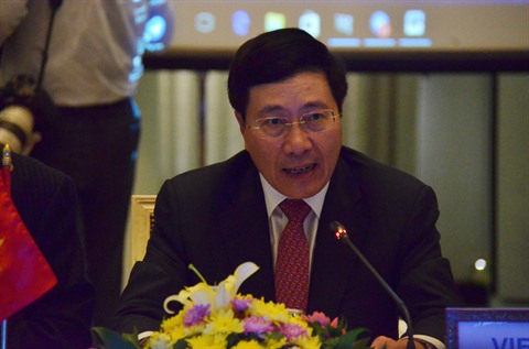 | Le vice-Premier ministre et ministre des AE, Pham Binh Minh, à la 15e réunion du Comité mixte Vietnam-Cambodge, le 15 mars à Phnom Penh. |